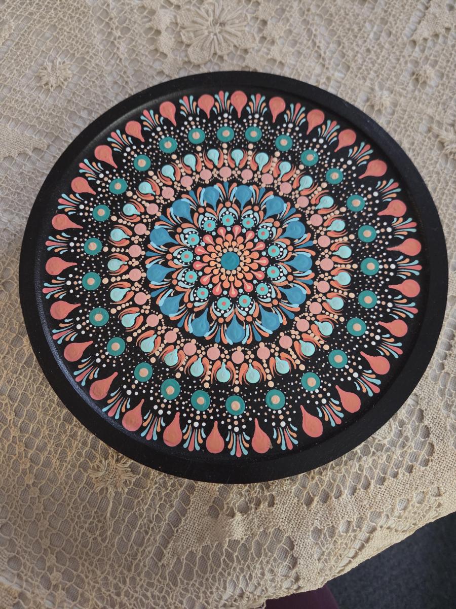 Marsha, a retired math teacher, freehand paints mandala designs on various objects, including earrings, ceramic skulls, wooden decor, record albums, mugs, and more. Every piece is unique and mesmerizing from creation to finished product.